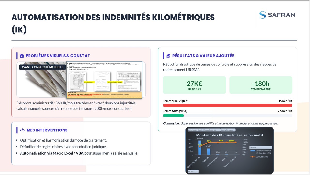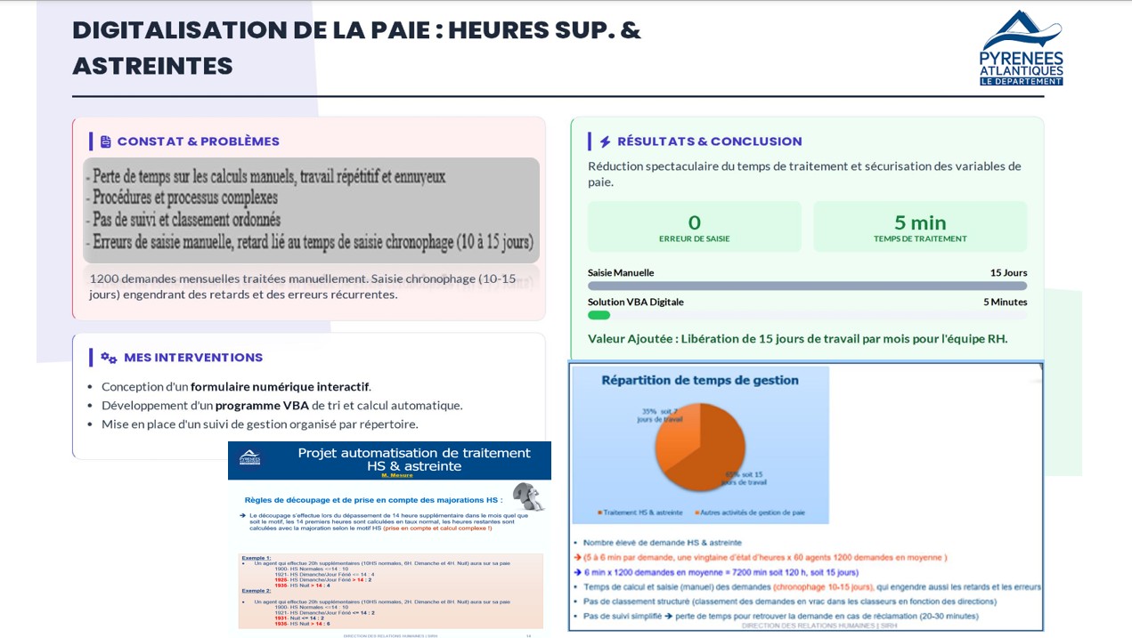 • automatisation de processus de paie (indemnités kilométriques, HS & astreintes) avec jusqu’à 180 h de saisie supprimées par mois et 27 000 € d’économies annuelles.