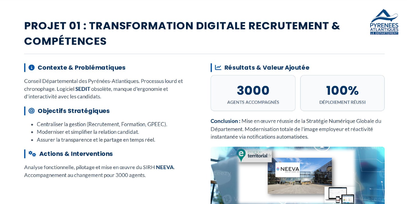• digitalisation du recrutement & des compétences pour une collectivité de 3000 agents (NEEVA).